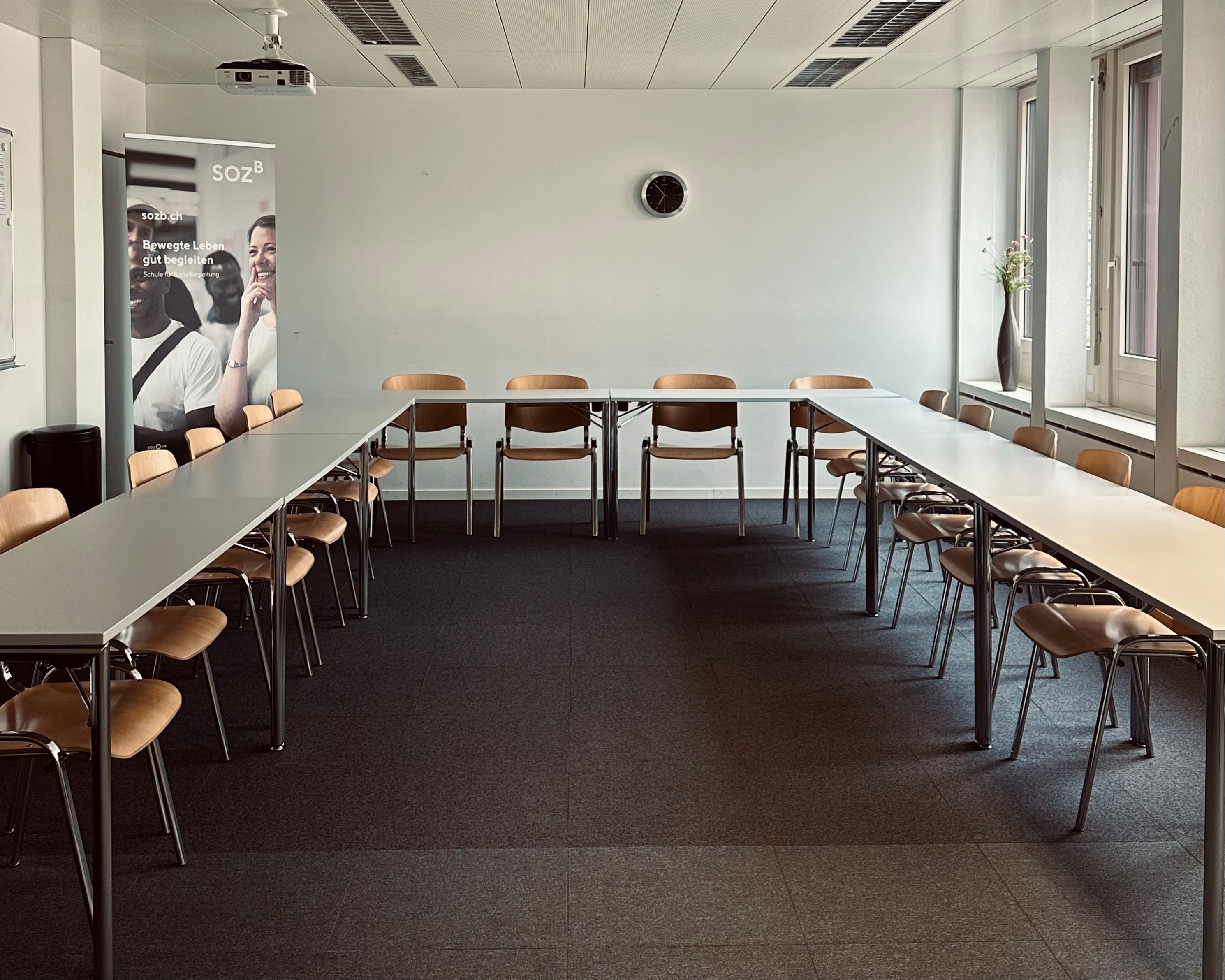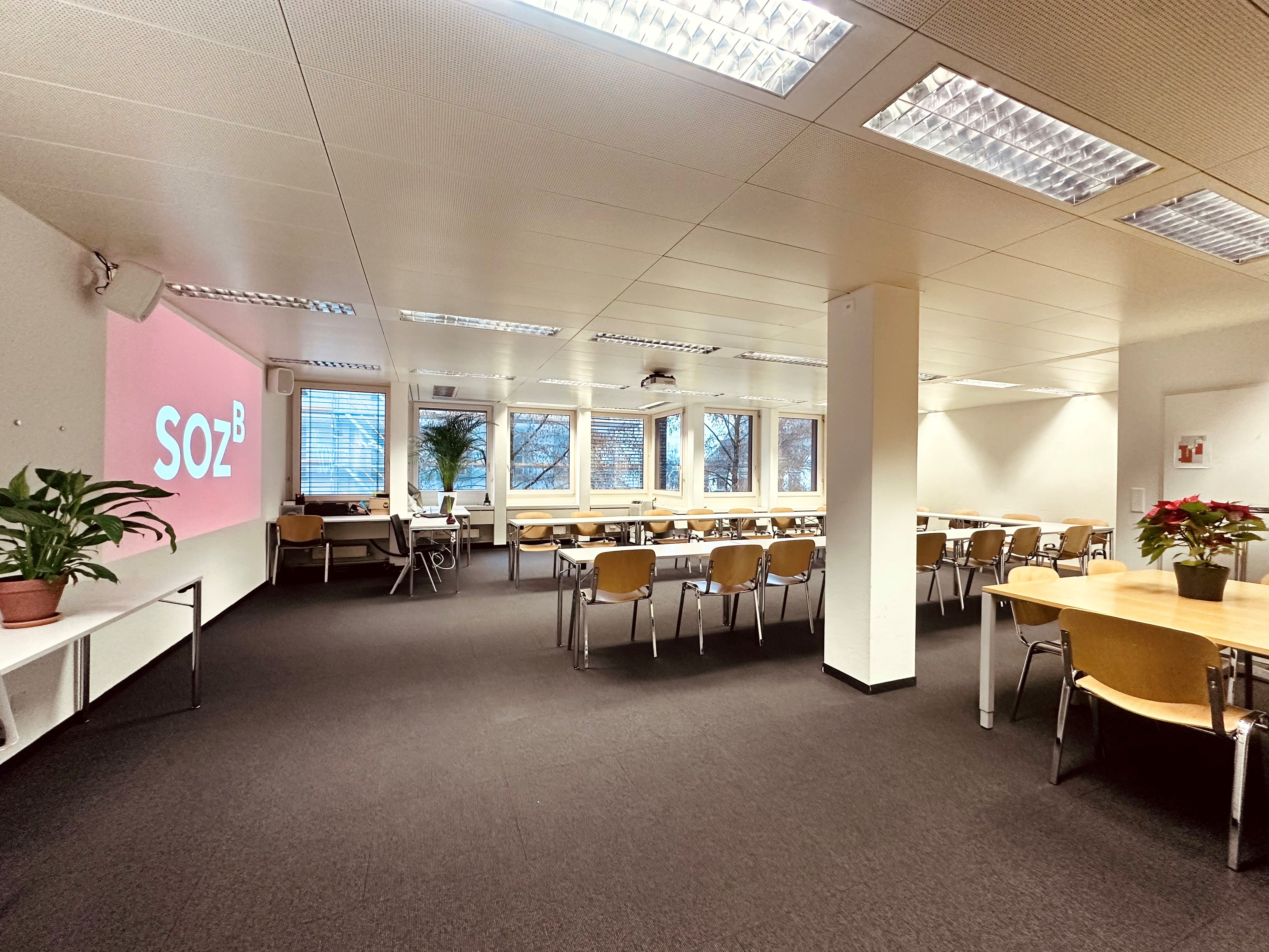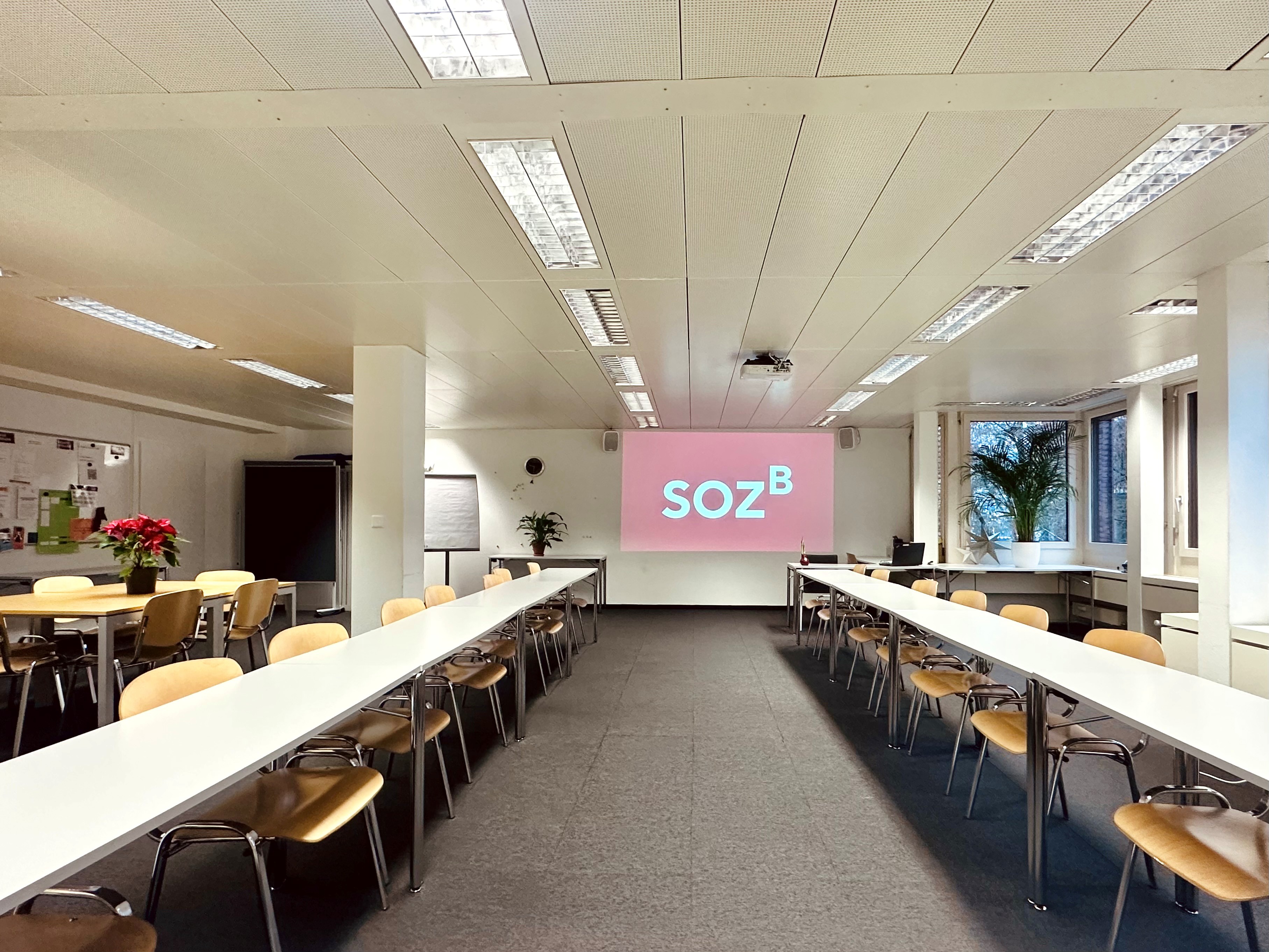 ausgerüstet mit: Beamer, Pinnwand, Flipchart, Klimaanlage und Garderobe.